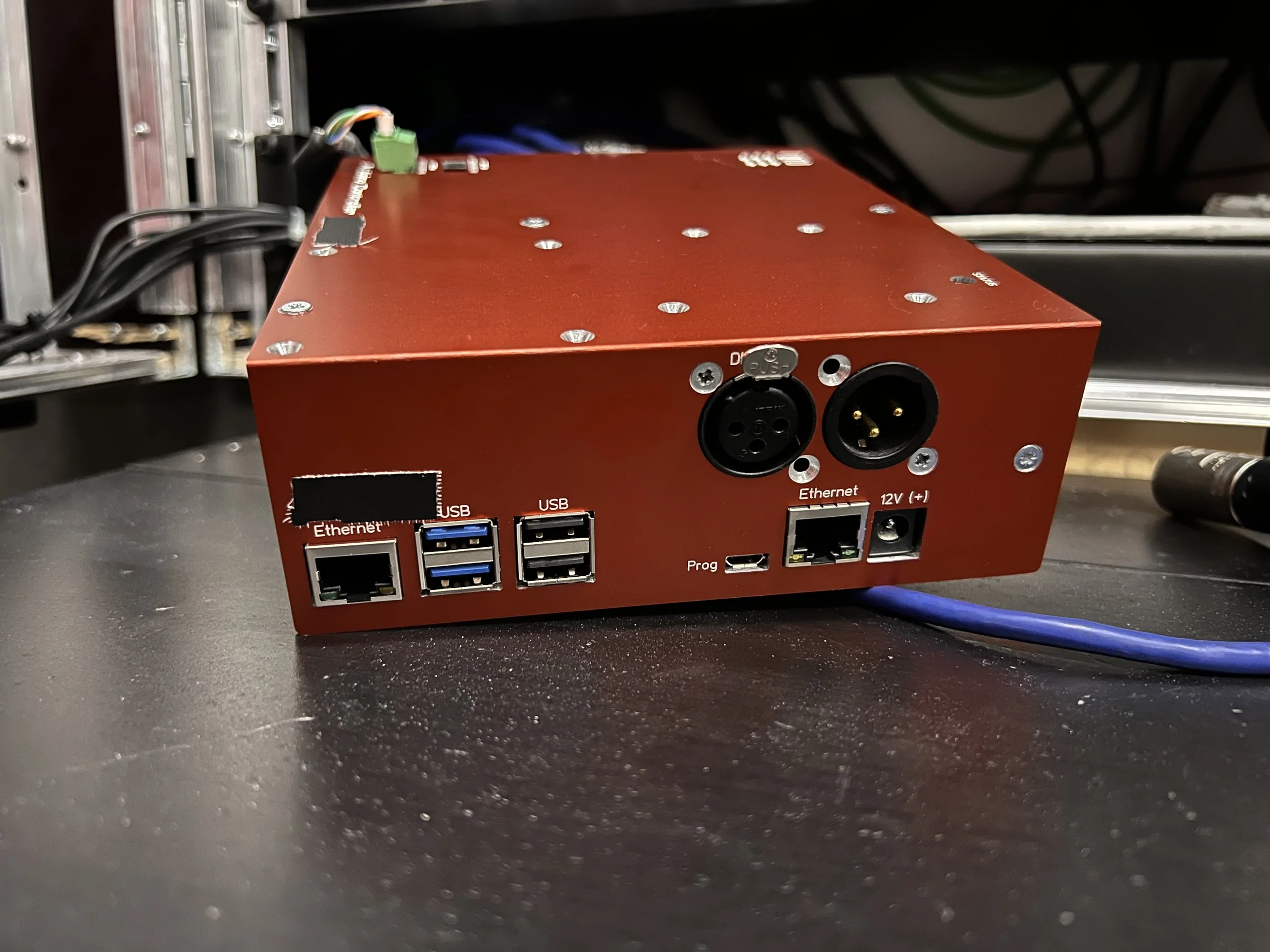 Additionally, a simple roll-off green screen can be extended behind the talent. The table is equipped with wheels, allowing for almost free movement, constrained only by the length of the multi-cable. All the equipment is hidden inside the rack.